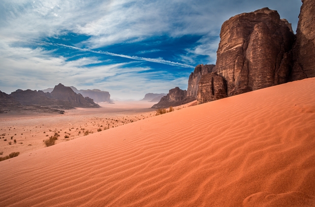 | Pustinjski krajolik Wadi Rum | Veličanstvena pustinjska dolina s dramatičnim stijenama i krajolicima nalik površini Mjeseca. |