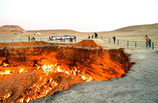 Doručak. Slijedi nam polazak prema graničnom prijelazu sa Turkmenistanom - Shavat. Nakon obavljanja papirologije, koje na ovoj granici može potrajati i do 3-4 sata, idemo prema mjestu Kunya Urgench, još jedan lokalitet pod zaštitom UNESC-a, također poznat kao Stari Urgench ili Urganj. Ovo je bio je grad u sjevernom Turkmenistanu, južno od granice s Uzbekistanom. To je mjesto drevnog grada Gurgānj, koji sadrži ruševine glavnog grada Khwarazma. Njegovi su stanovnici napustili grad početkom osamnaestog stoljeća kako bi izgradili novo naselje, a Konye-Urgench je od tada ostao neometan. Godine 2005. ruševine starog Urgencha uvrštene su na UNESCO-v popis mjesta svjetske baštine. Ovdje ćemo imati priliku istražiti povijesni park s minaretom Kutlug Timur - mauzolej Turabeka Khanuma - mauzolej Tekesh - mauzolejem Il Arslan - Karavansarayska vrata. Negdje u okolici ćemo i napraviti pauzu za ručak. Potom krećemo na vožnju prema Derweze, gdje ćemo posjetiti takozvana " Vrata Pakla ". Plinski krater Derweze, službeno Sjaj Karakuma, goruće je polje prirodnog plina koje se urušilo u pećinu u blizini Derweze. Stotine vatri prirodnog plina i blata osvjetljavaju dno i rub kratera. Krater gori od 1971. Kako je krater nastao nije poznato, ali geo-inženjeri su zapalili krater kako bi spriječili širenje otrovnih plinova. Promjer kratera je čak 70 metara. Dolazak u kamp u Derweze gdje ćemo imati priliku noćiti u Yurtama, kao nekada putnici karavana na putu svile. Također nas očekuje ukusan roštilj za večeru u pustinji. Noćenje.